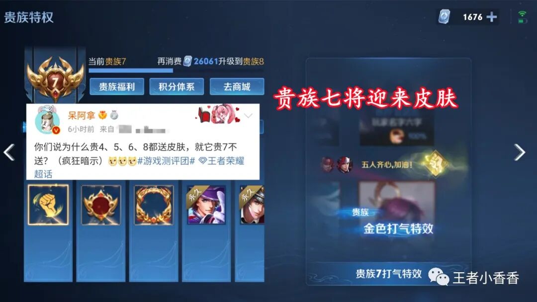 王者荣耀目前在贵族系统当中从贵族四就有专属皮肤,贵族五,贵族六,贵族八都有专属皮肤,而唯独贵族七没有皮肤,近期不少大咖都是在暗示贵族七即将上线新皮肤了,要知道贵族八是虞姬——启明星使传说皮肤,因此这款贵族七大概率是一款高品质史诗皮肤,而后续更高等级的贵族九和贵族十也会有专属皮肤上线的。