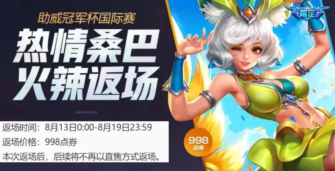 除此以外,妲己的热情桑巴皮肤也将会在8月13日进行返场,返场时需要998点券获取,这是热情桑巴最近一次进行返场,以后不会再以直售的形式进行返场了。热情桑巴皮肤是比较古早的了,因此后续这款皮肤大概率还会进行优化重做,还是比较令人期待的。