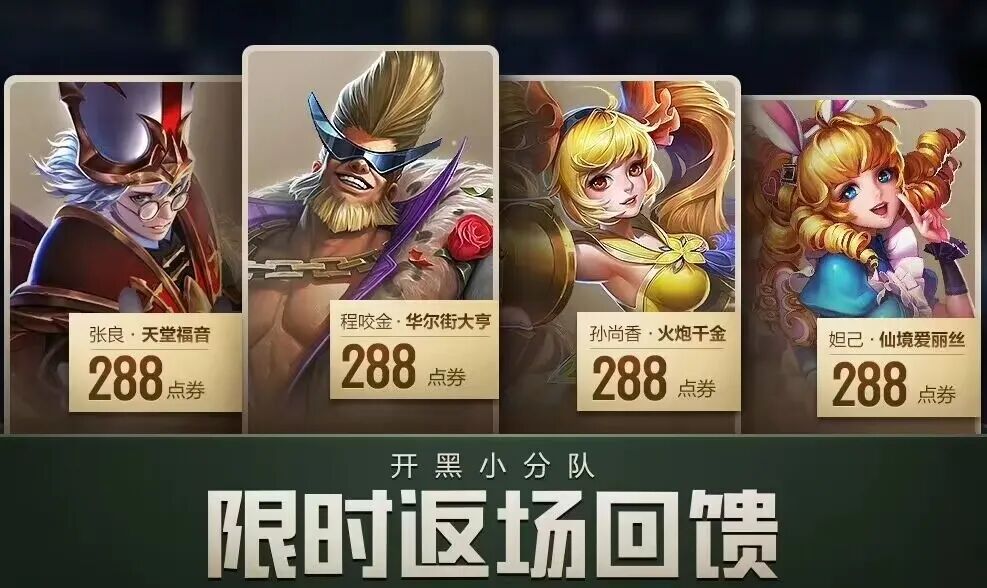 除此以外,后续还将会有其他的限定皮肤返场活动开启,张良的天堂福音、程咬金的华尔街大亨、孙尚香的火炮千金、妲己的仙境爱丽丝等四款皮肤也将会进行返场了。
