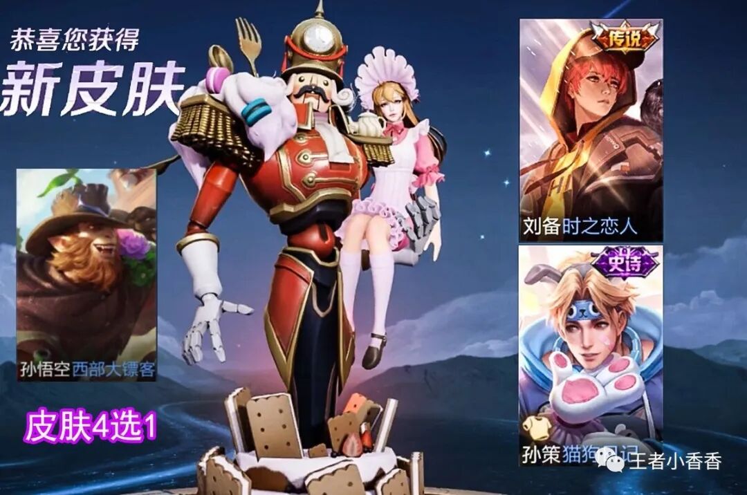 干将莫邪——胡桃夹子皮肤上线以后,游戏内会一同上线一个抽奖活动,完成活动任务即可活动抽奖次数,有概率抽到胡桃夹子永久皮肤,不过概率非常小。除了胡桃夹子以外,还有概率抽到刘备——时之恋人、孙策——猫狗日记、孙悟空——西部大镖客等永久皮肤,这些皮肤的品质都是非常不错的。