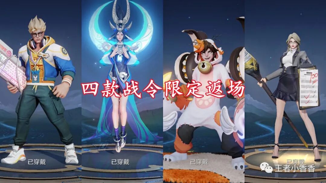 S15赛季的两款战令限定皮肤分别是典韦——蓝屏警告、女娲——朔望之晖,S21赛季的两款战令限定皮肤分别是雅典娜——单词大作战、蒙犽——狂想玩偶喵,这四款皮肤应该都会在下周进行返场。战令限定皮肤都是以抽奖形式返场,需要战令币进行返场,因此喜欢这几款皮肤的玩家可以提前准备好战令币。