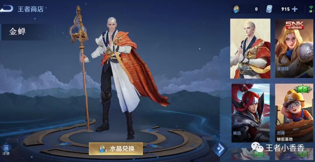 最后一种方式就是新英雄金蝉将会加入王者商店当中以一颗王者水晶进行兑换,开启兑换的时间也是比较久远,这也是金蝉后续永久获取的唯一方式,不会加入英雄碎片商店当中。