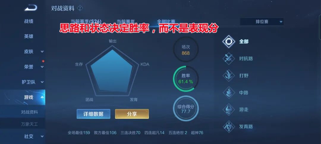 但是,这种Carry等级的玩家一旦晋级到高分段以后,其表现分依然能够傲视其他玩家,但是胜率等方面的数据会相对下降很多。