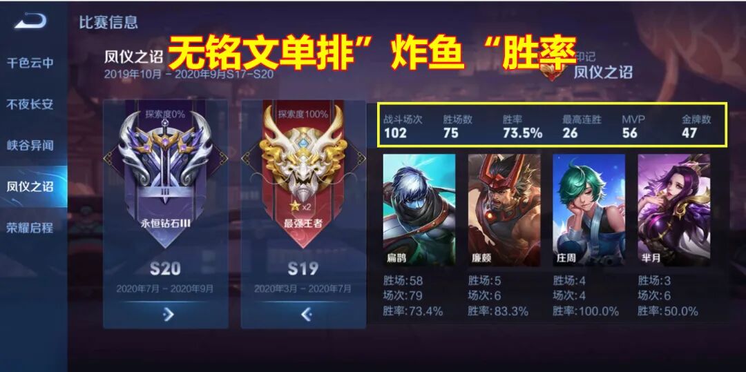 老马在S19赛季做扁鹊攻略,在没有铭文的情况下,从青铜单排到了王者,而且胜率还可以,但不得不承认,在星耀阶段以后,运气占了30%的成分。