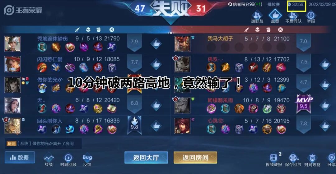 就那上图来说,如果老马和铠的廉颇出的是攻击装,鲁班奔放一点,根本就不会输,奈何鲁班、墨子、周瑜都在练英雄,过分依赖队友且在大优势的情况下还不敢打……