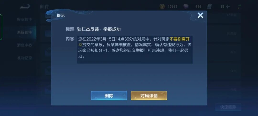 不过,上图中的摆烂玩家,并不只是简单的选择摆烂,他在摆烂成功以后反手给了被摆队友一个举报,而且成功了!