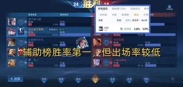 各个段位刘邦的出场率成长均接近翻倍,胜率也有小幅度的上涨,尤其是中分段刘邦的胜率上涨进2%,达到了52.12%。由此可见,高机动性坦边,胜率有很大的涨幅空间。