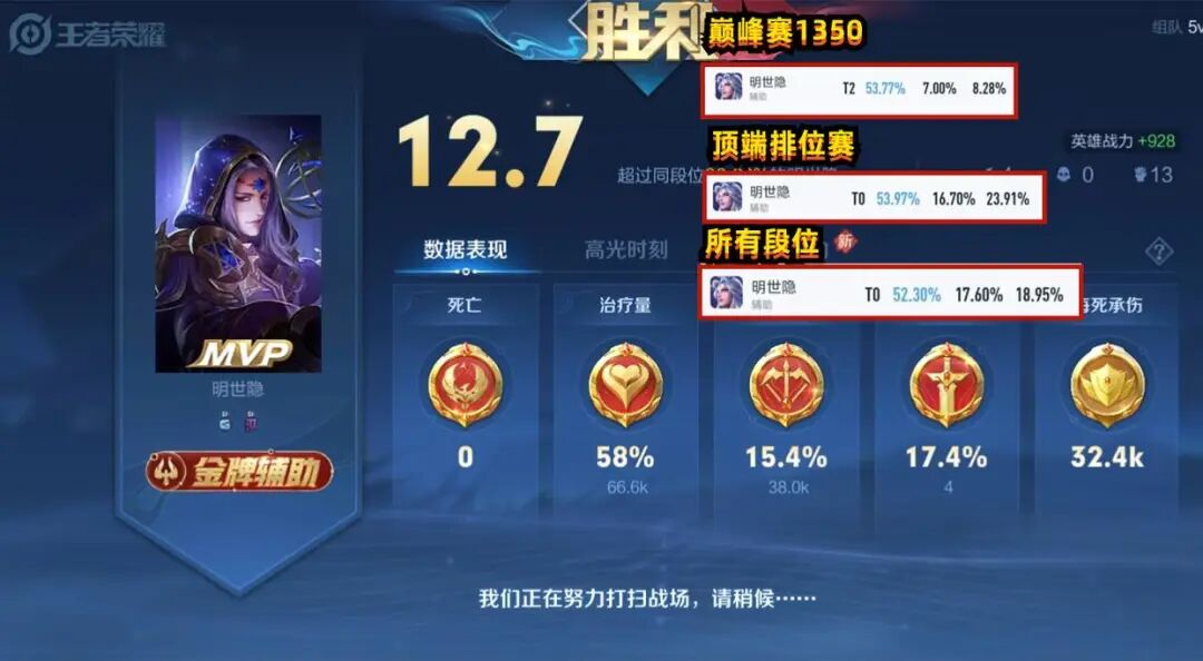 目前,明世隐在各个段位数据表现均非常亮眼,非常适配于无主观意识的辅助玩家。