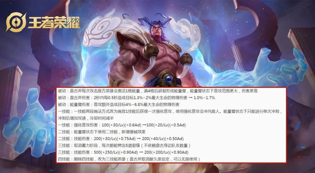 本次版本更新,盘古品质升级,原本操作上的自限性被清除,现阶段的盘古只有三个技能,极易上手而且特点鲜明。
