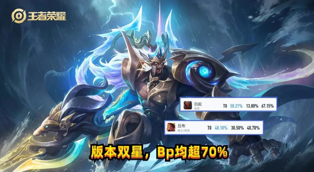 本赛季的版本双星,分别是白起和吕布,两位英雄在高端局的Bp分别达到80.95%(白起巅峰赛1350+数据)及71.2%(吕布顶端局数据),是名副其实的版本之子。