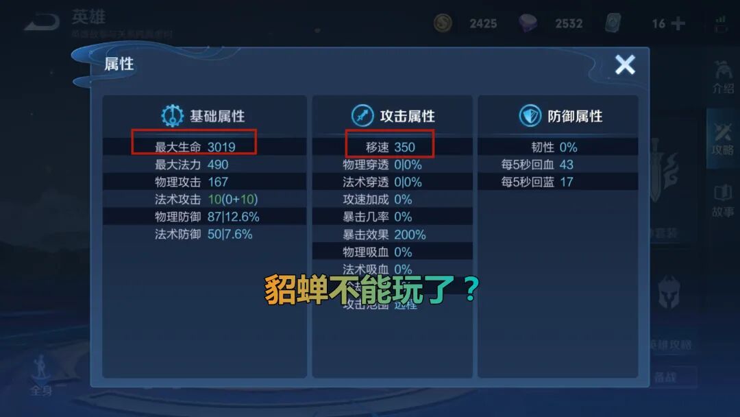 在这样的调整下,貂蝉的初始血量比原来高51.2,满级血量比原来高194,整体来说前后期的容错率都增加了非常多。