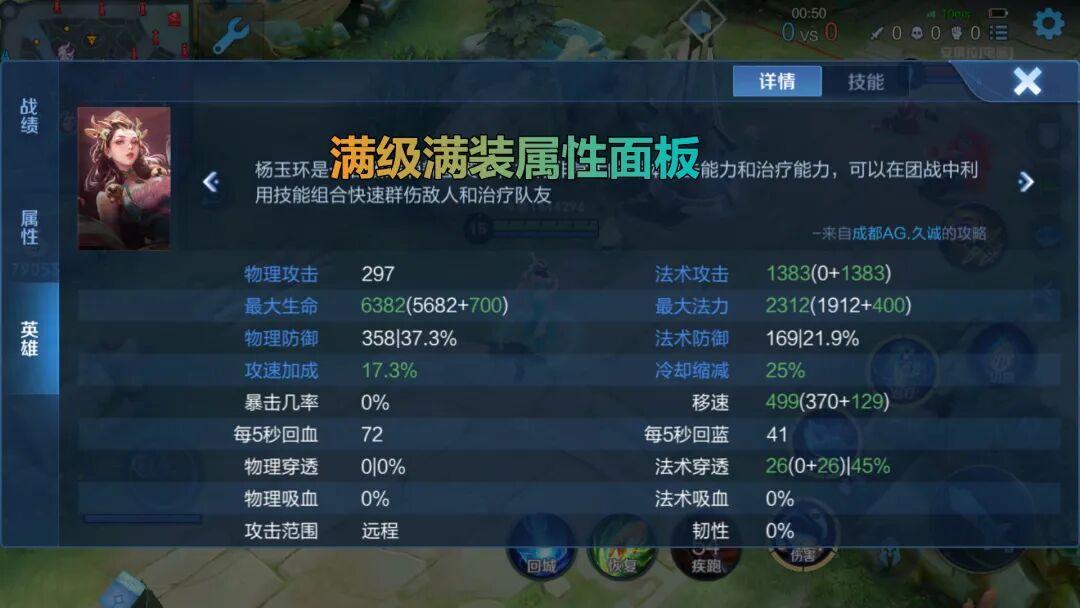 这样的数据能够带来什么样的收益呢?按照上述公式,集合杨玉环的初始血量2966、满满级装(没有考虑等级数据成长)血量6382,初始AP0、满装AP1383。
