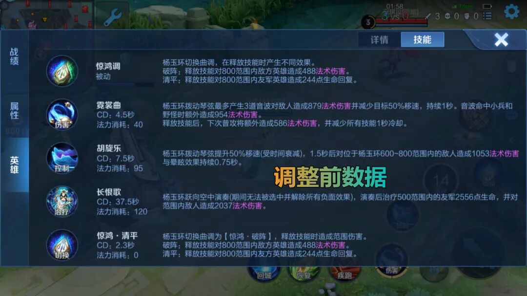 通过计算我们可以发现,杨玉环的调整数据调整,使得杨玉环被动和前期的回复能力提升,后期大招回复能力略微提升,技能伤害得到了一定程度的提升,但是一技能强普的降低,影响到杨玉环的持续输出,最多降低282.3-84-63.83=134.47。