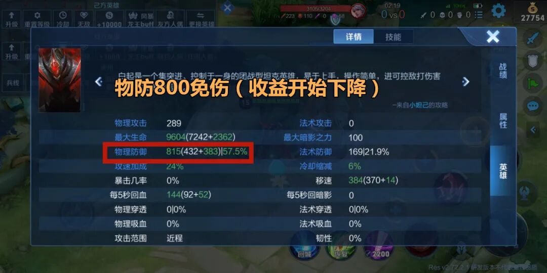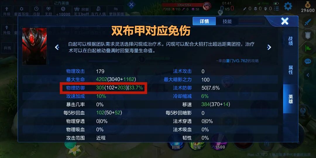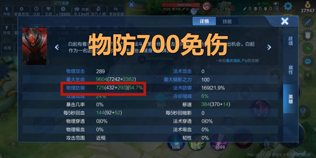 王者荣耀中双方属性阈值为602,在600、700、800、900等节点,防御带来的免伤分别为50%、53.84%、57.14%、60%。从2.4%的数据来看,双抗800或者单针对抗性800时是单出法装贤者披风的节点。