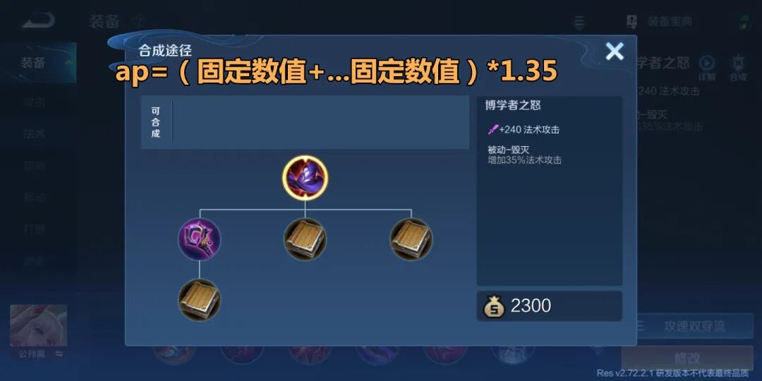 如何达到1000呢?贤者披风ap数值为160ap,博学者之怒240ap+35%属性加成,计算上35%属性加成,除去两件装备,我们需要的ap数值为1000/1.35-160-240=340。