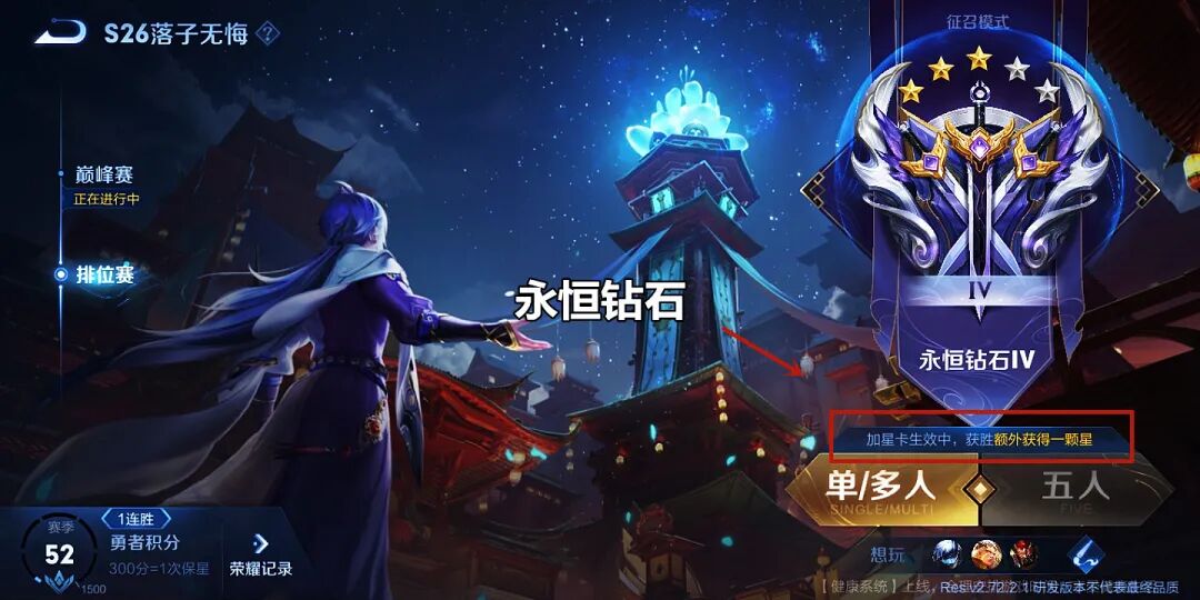S26赛季,上荣耀段位相比之前的赛季,要简单很多,因为有了“保护机制”,出现25星、50星两个小节点,但是,荣耀以上就只能拼实力了,因为荣耀王者到百星王者有50颗星的跨度。