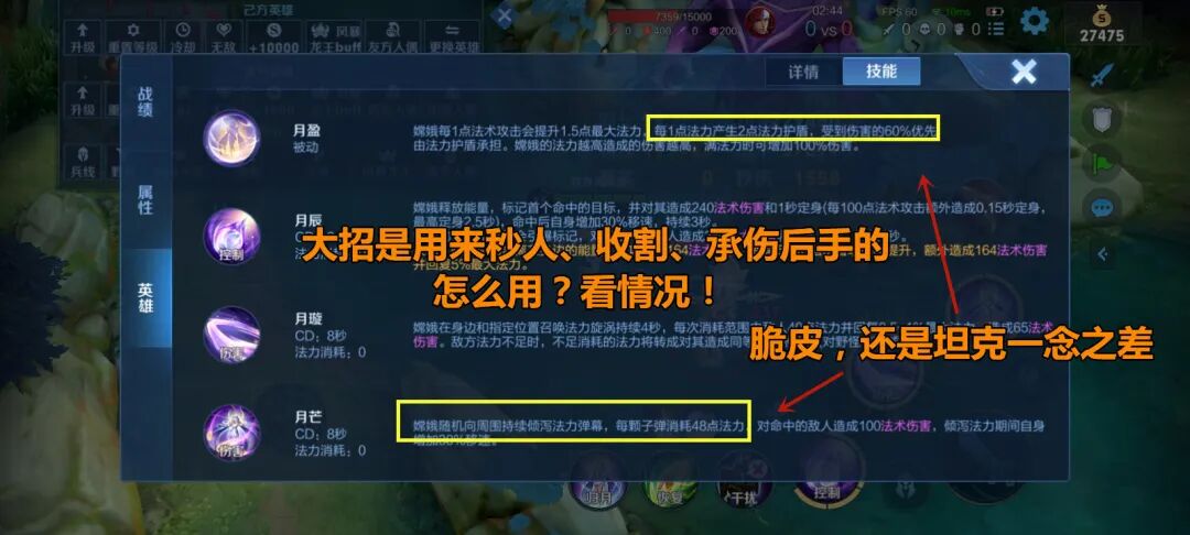 综上所述,嫦娥1技能的加点时间,我们可以根据打法选择,如果节奏卡得不好,多依赖普攻和消耗,ap有欠缺的话,可以选择不要1技能那微弱的控制。