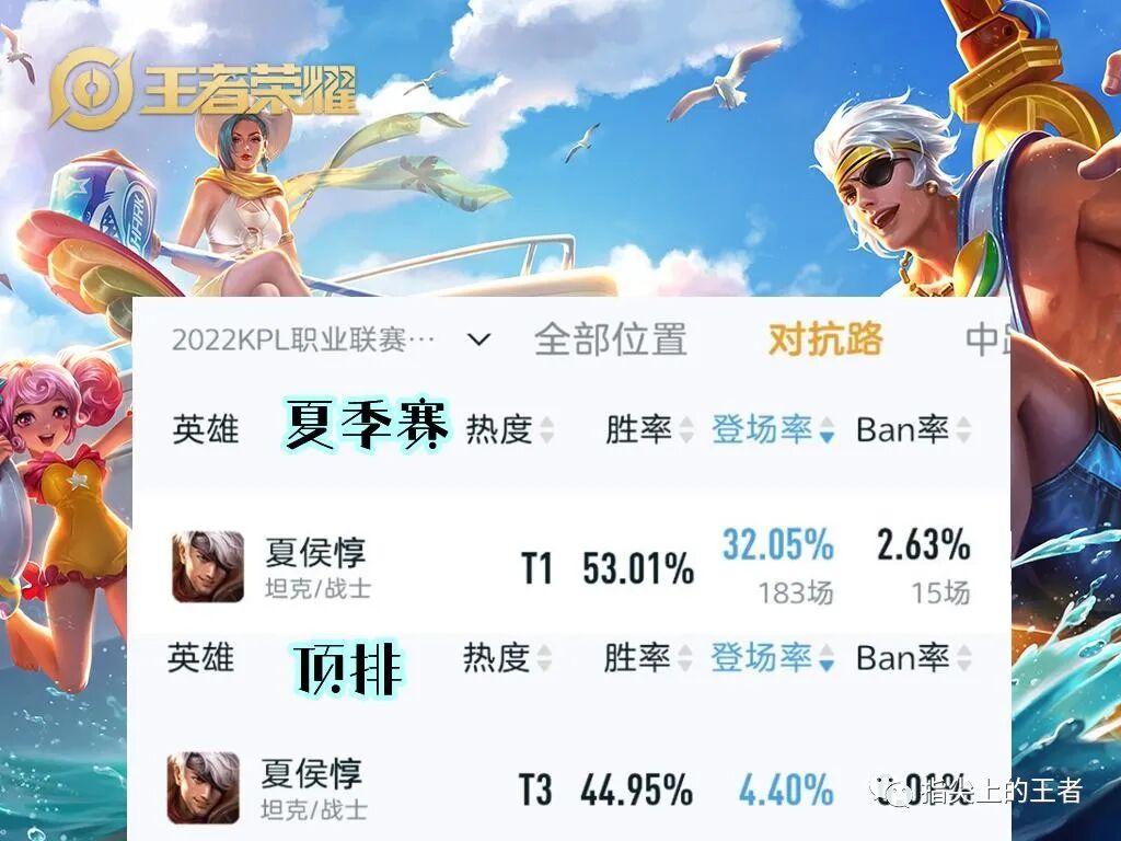 用KPL夏季赛的数据说话,登场率有32%,胜率竟也高达53%,而在路人局中,不说中低分段,顶端局排位夏侯惇的数据4.4%出场率和45%的胜率,同一个英雄,为何差距如此大?