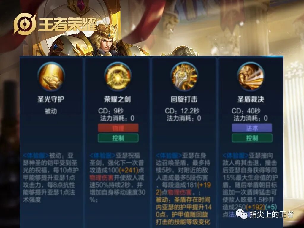 1技能沉默取消,变成了减速,以及增加自身的额移速,带双防可以增加物攻和法强,2技能开启后增加护甲,大招终于不是自控0.8,控敌0.5了,长达1.5秒的控制时间,还能给自己增加护盾,然而这个调整没过多久就被取消了,亚瑟回滚到了之前的版本,并一直保留到现在。