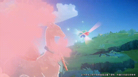 大招附着在队友身上的效果还是挺好看的,护盾始终是以这个角度面向玩家,有心形,有类似 云中君翅膀的元素,而天空中的瑶也会出现一些类似彩蛋的动作,比如附身云中君会比心,时间长没动作会有打哈欠的效果,队友位移速度快,在追赶的时候有开飞机的动作,细节处刻画的还是不错的。