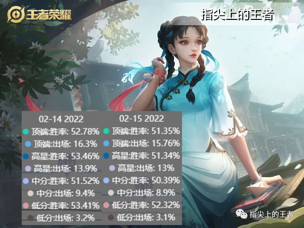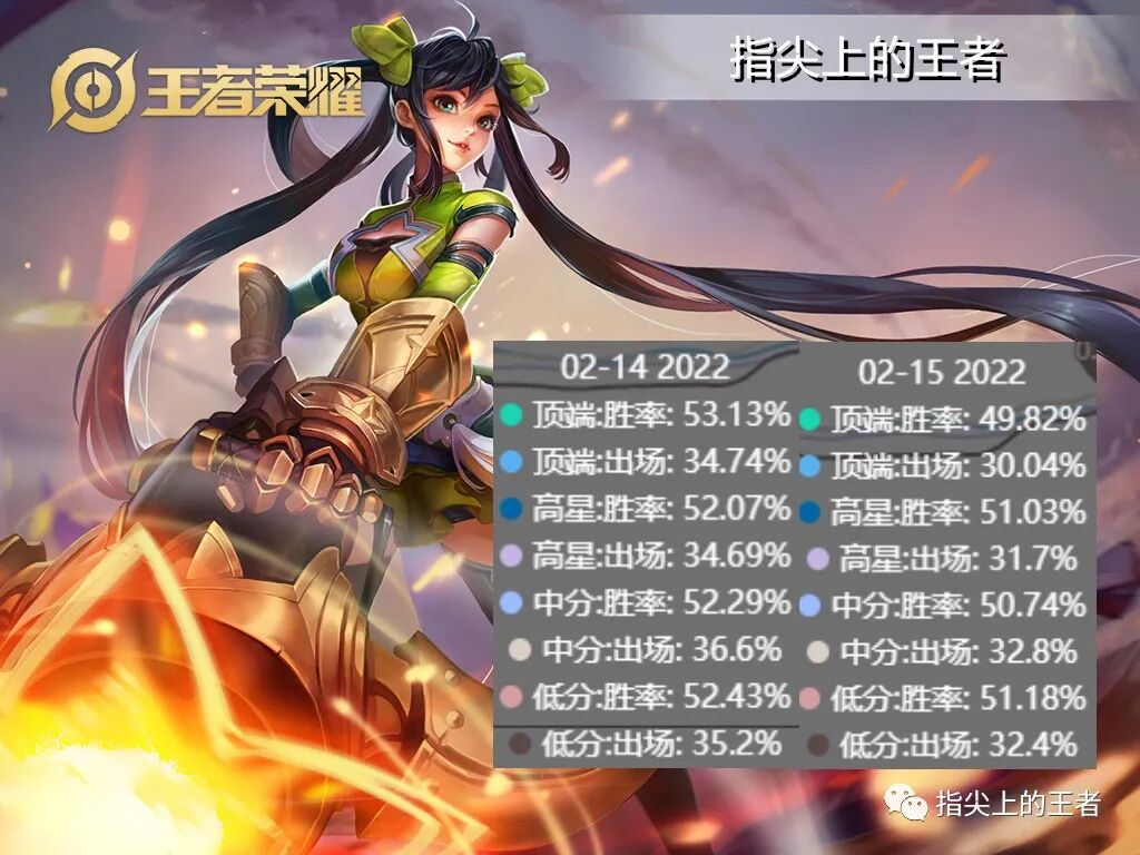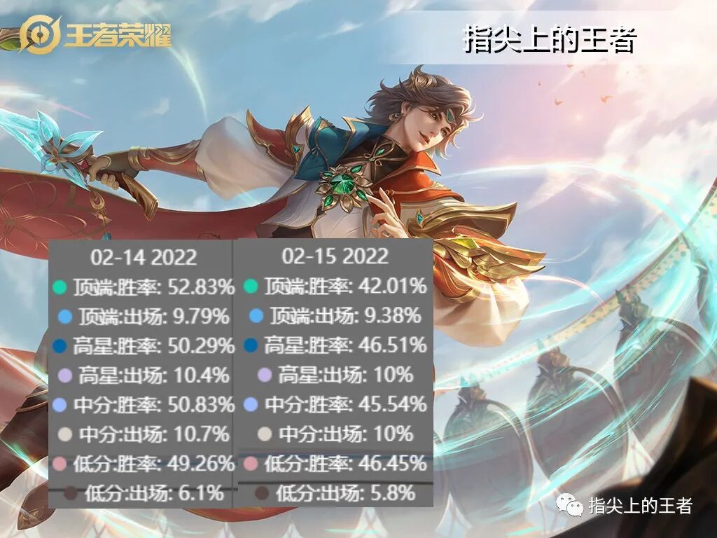 大家好我是指尖,2.15日王者荣耀正式服更新,对六名英雄,以及凝冰之息和巨人之握装备进行了调整,一天的数据公布,那么受到影响的英雄在各个分段里的出场率和禁用率如何呢?跟着指尖一起来看看吧。