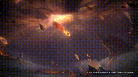 出场动画,九州崩裂,天石乱坠,女娲手持五色神石冲向了天空上崩塌开的孔洞,完毕后天地复归清明,从背景动画可以看到,山河复苏,百川归位。