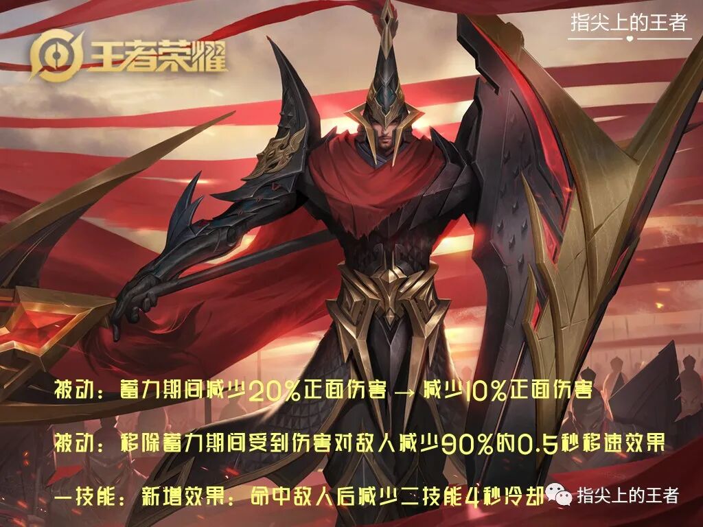 蒙恬的调整幅度比较大,首先被动技能的正面免伤效果从20%降至10%,并且移除了蓄力期间挨打时对敌人的减速,但是增加了1技能命中敌人后减少4秒冷却的机制。