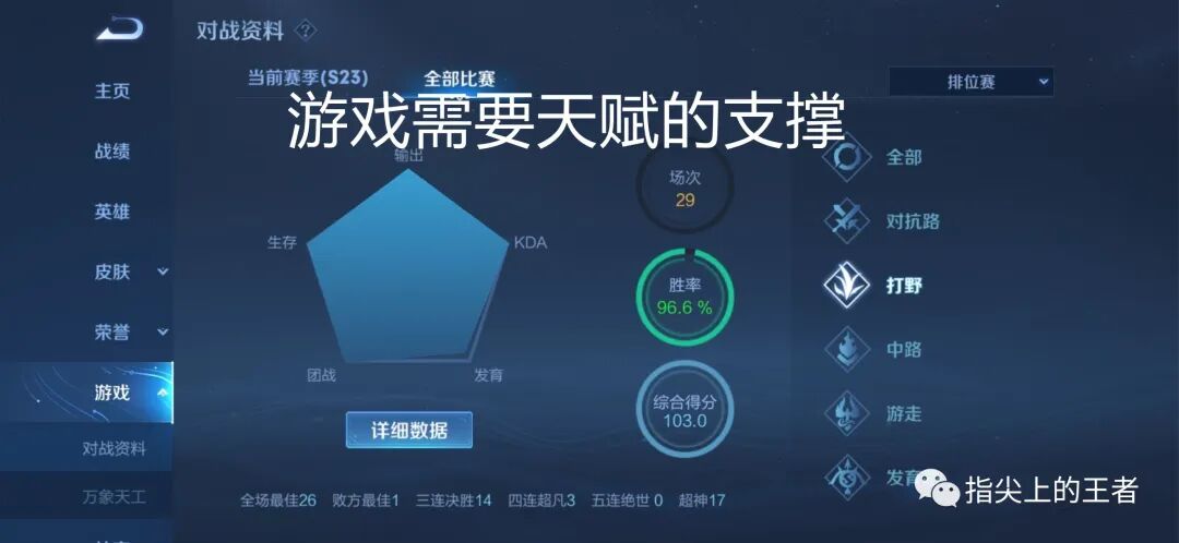 打个比方,有些人打游戏天生就是激进派,就是喜欢直接动手说话,所以他玩不来女娲这类成长型的英雄,同样是玩射手,可能李元芳这种中期英雄会打的很强,大神鲁班后羿需要猥琐且大后期成型的就玩不来,因为太想操作了,所以玩不同的英雄也是需要天赋的。