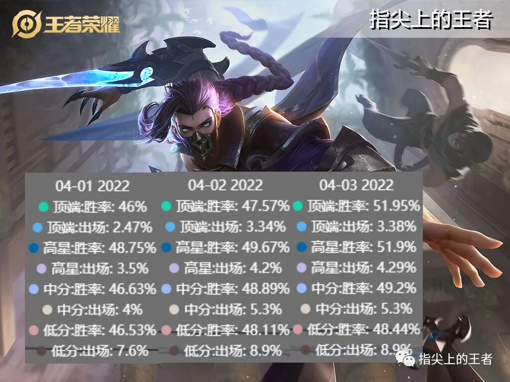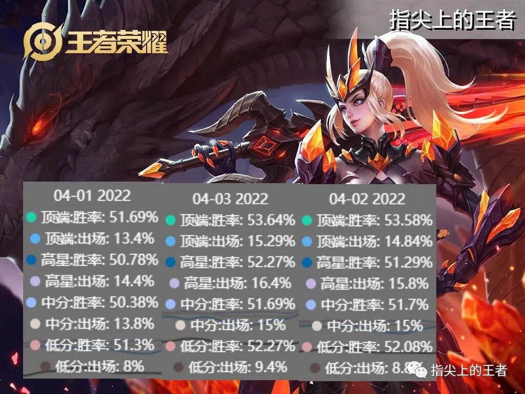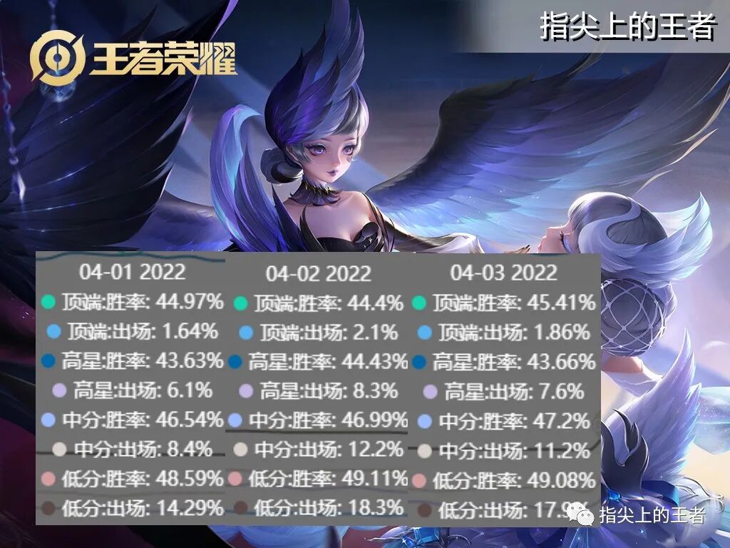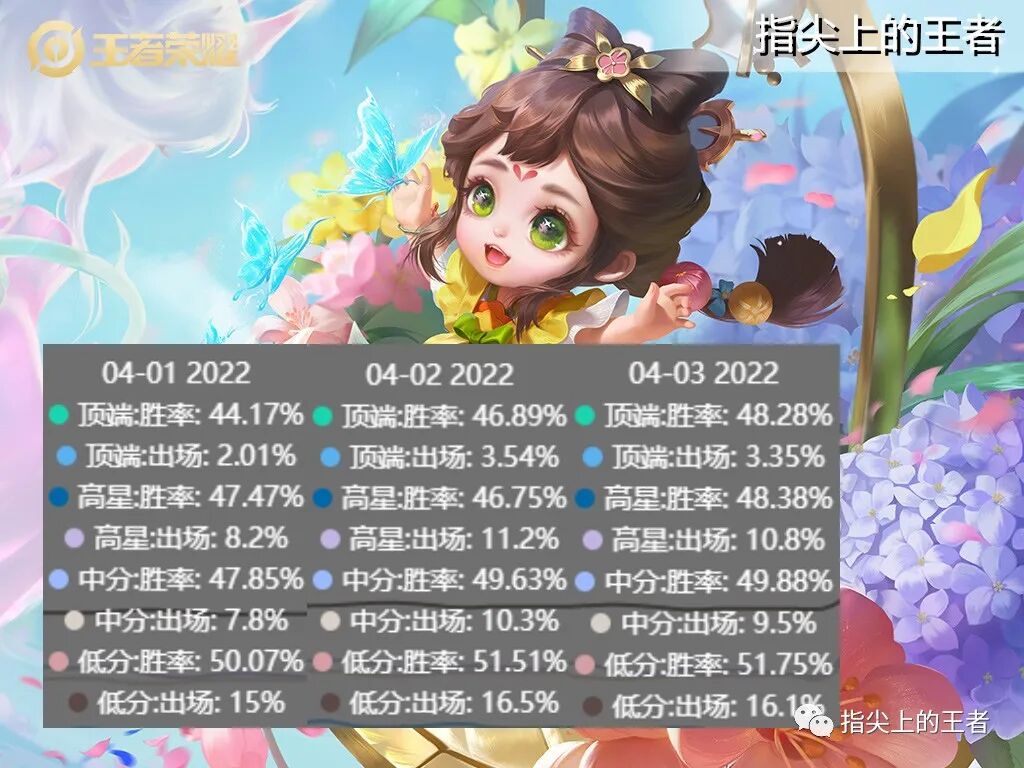 大家好我是指尖,4.2日王者荣耀正式服更新,对五个英雄进行了平衡性的调整,两天之后他们的数据表现如何了呢?我们一起来看看吧。