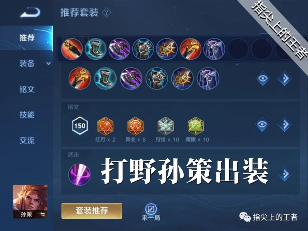 打野孙策因为没有晕眩,导致伤害不一定很稳定,但是可以利用冰霜冲击的晕眩效果来代替,出装可以按照这套来,对于脆皮英雄来说还是能够轻松秒杀的,铭文方面补足了一点攻速,打野孙策不比边路,因为普攻更多,建议带点攻速。
