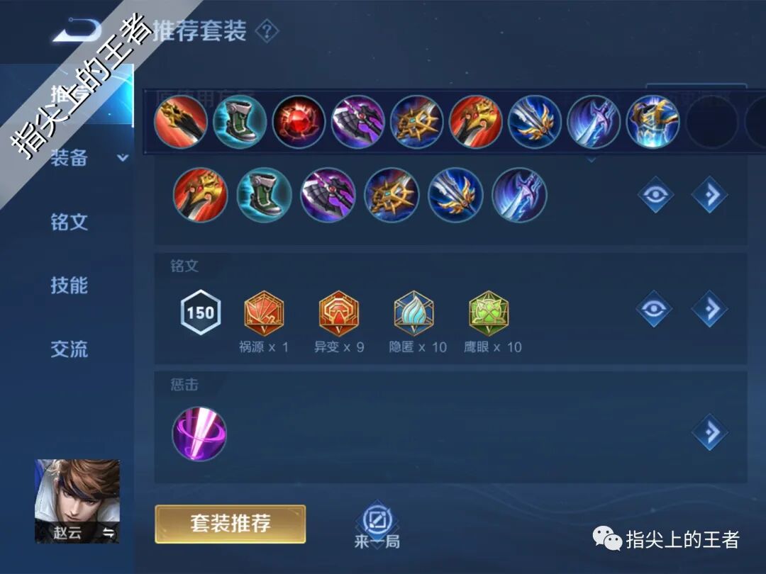 那就是宗师之力加破军的纯输出玩法,宗师之力使用技能可以提升12%的移速,赵云1技能时时赶路,能大幅度提升自身的节奏,也为后期卖鞋子提供了一定程度上的移速补充,强普搭配宗师的额外伤害,可以轻松把敌人血量压制到半血以下,此时2技能拥有破军的伤害加成,对于半肉的后排来说都有着极强的压制效果。