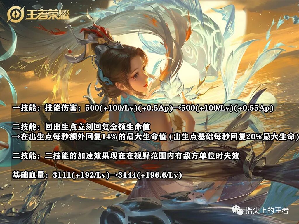 2技能的瞬间回复变成了在基础回复外增加了14%的回复效果,什么意思呢?王者荣耀泉水的回复是每秒回复20%血量,那么利用大乔的回城,回复效果就会变成34%,也就是说你只有32%血量以下时,需要3秒才能回满,当然了,血量越接近32%,两秒钟的回血也越接近百分百,不一定真要等到完全回满。