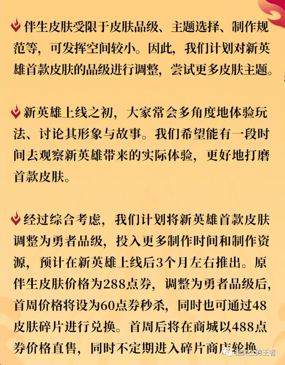 第三个是汇总,未来的伴生皮肤会全部升级到勇者,所以需要投入更多的制作时间,所以在新英雄上线的3个月左右上线,而伴生皮肤288点券,升级为勇者后首周价格60点券,碎片商店48皮肤碎片,首周之后488点券。