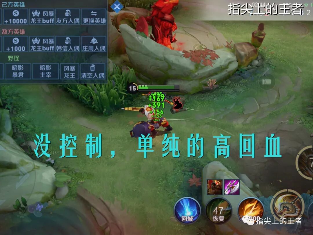回血,高额的回血,的确,在王者荣耀中,生命值就是一切,程咬金技能全部耗血,但也同时会回血,大招一开,作为一个全肉的坦克,在不死鸟之眼的加持下相当于有了两管血量,搭配上一个较远距离的位移,让程咬金很难被抓死。
