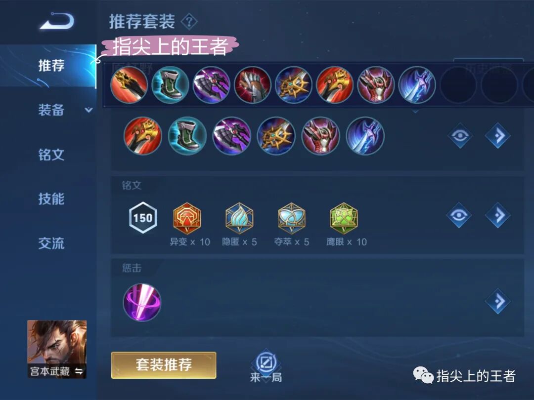 以上是我给宫本设计的一套出装,暗影战斧加宗师之力是主力输出,宫本武藏的强化普攻都可以触发暴击,因此宗师之力基本上会是他的标配,最后补一个纯净苍穹,防止落地被秒,三秒的免伤时间,足够宫本砍死一个脆皮了。
