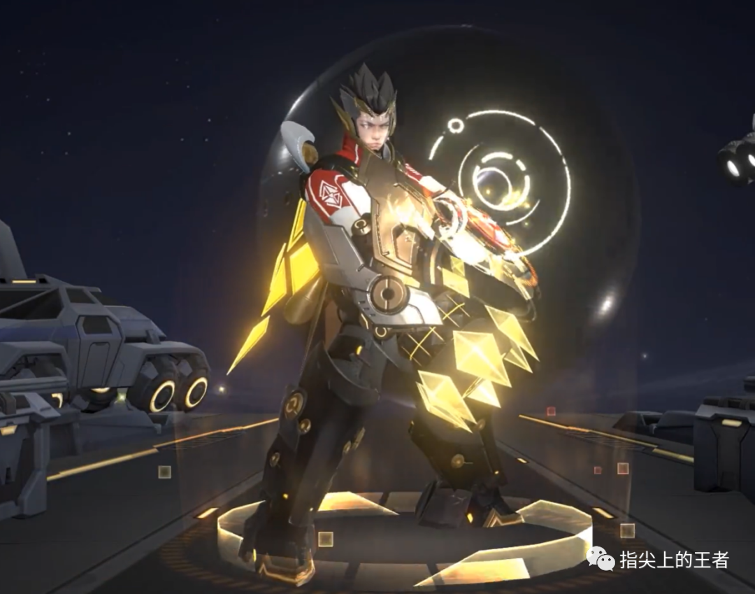 上半身穿着红白相间的制服搭配金色能量,彰显狄仁杰的公正和威严;下半身则是代表漆黑星空的黑金搭配,装备可在失重环境下进行灵活行动的喷射腿甲。武器设计上则是威力与科技感兼备的脉冲粒子炮,沉稳干练的黑色金属质感也更加契合人物的身份。