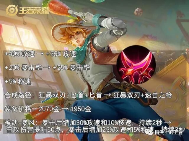射手专属装备,削弱了5%的暴击,增加了5%的移速,降低了50金币,这是加强还是削弱呢?暴击率是射手很需要的属性,但移速也很重要,它最大影响的可能是和无尽战刃搭配,一旦暴击率达不到无尽战刃需要的暴击阈值,那么影响就大了。