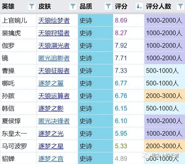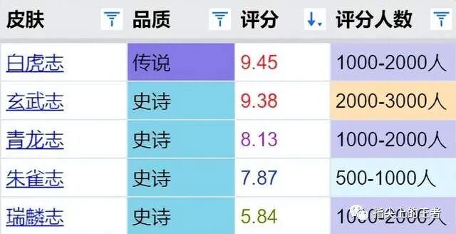 皮肤评分来自虎扑,由@贝悟空 整理。