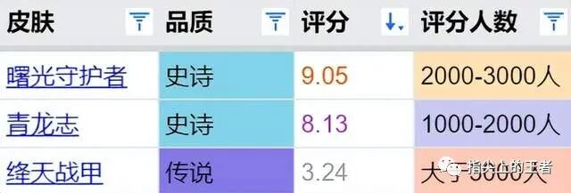 玩家评分中,曙光守护者也是超过9分的精品皮肤,因为是直售,所以随时都可以买,我想如果加上限定二字,还能在加点分,青龙志的评分不低,也在8分以上,但不如曙光守护者。