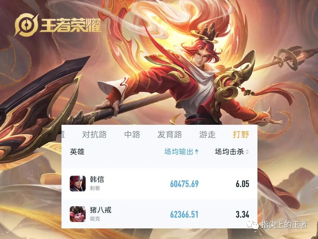 打野英雄中输出最低的是韩信,之前我跟大家讲过,韩信是经济永远第一,伤害永远倒第一的英雄,他的主要玩法是玩转经济,压缩敌方经济提升自己的经济,带来的团队优势是隐性的,后期玩转兵线,抵消的是他切后排无力的问题。