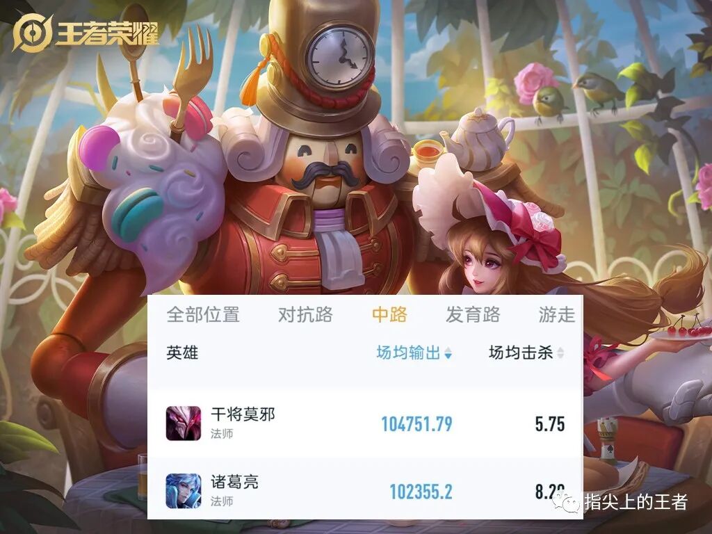 提到中路法师的输出,干将莫邪永远离不开这个话题,这个版本干将莫邪新增了专精装,不止胜率提升了,出场率也明显见长,因为消耗能力更强,所以为团队带来的收益也就更高,也因此他才重回了输出第一的宝座,为什么是重回?前两个版本干将莫邪的胜率只有40%出头(顶端局),各个分段的数据都很差,以至于输出榜只能排到前列,而不能进入前三。