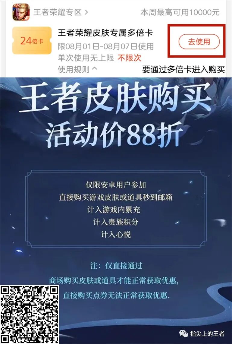 官网特惠充值:首周1200的皮肤,经过返利之后只要1056点券,再省144点券,扫描下图二维码,一定要记得领取24倍卡购买,可直接买,可用QB,但点券买皮肤无法返利,之后用积分换红包即可。
