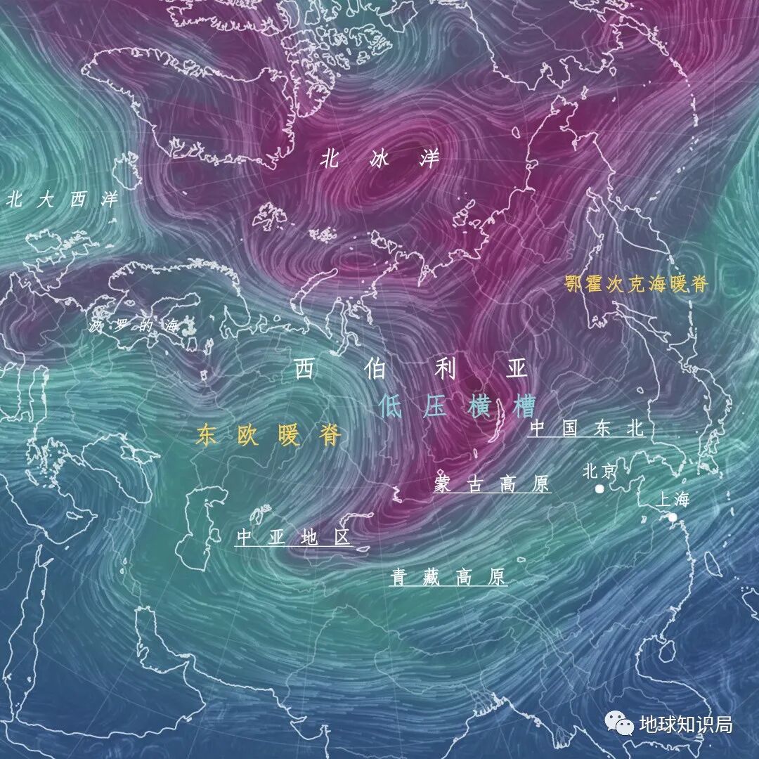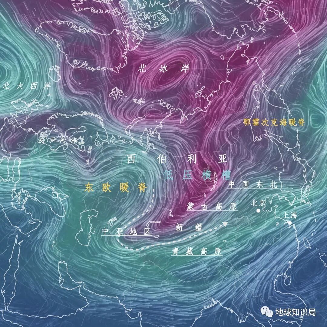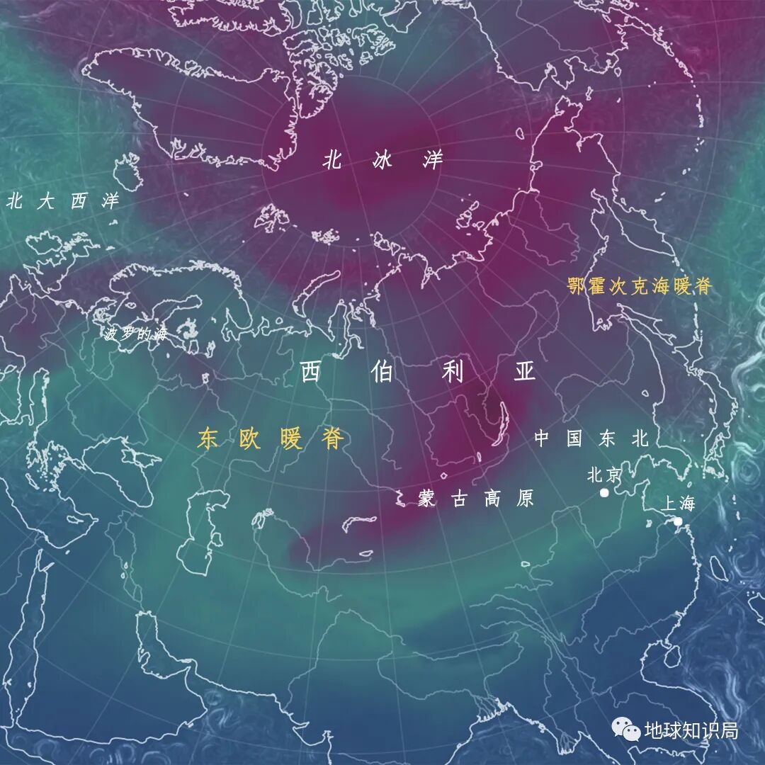 如果强冷空气仅仅是堆积在西伯利亚,就不会变成影响中国天气的寒潮。寒潮要出现,必须有暖空气汇入西伯利亚北部,挤占冷空气原有的位置,导致冷空气南下。