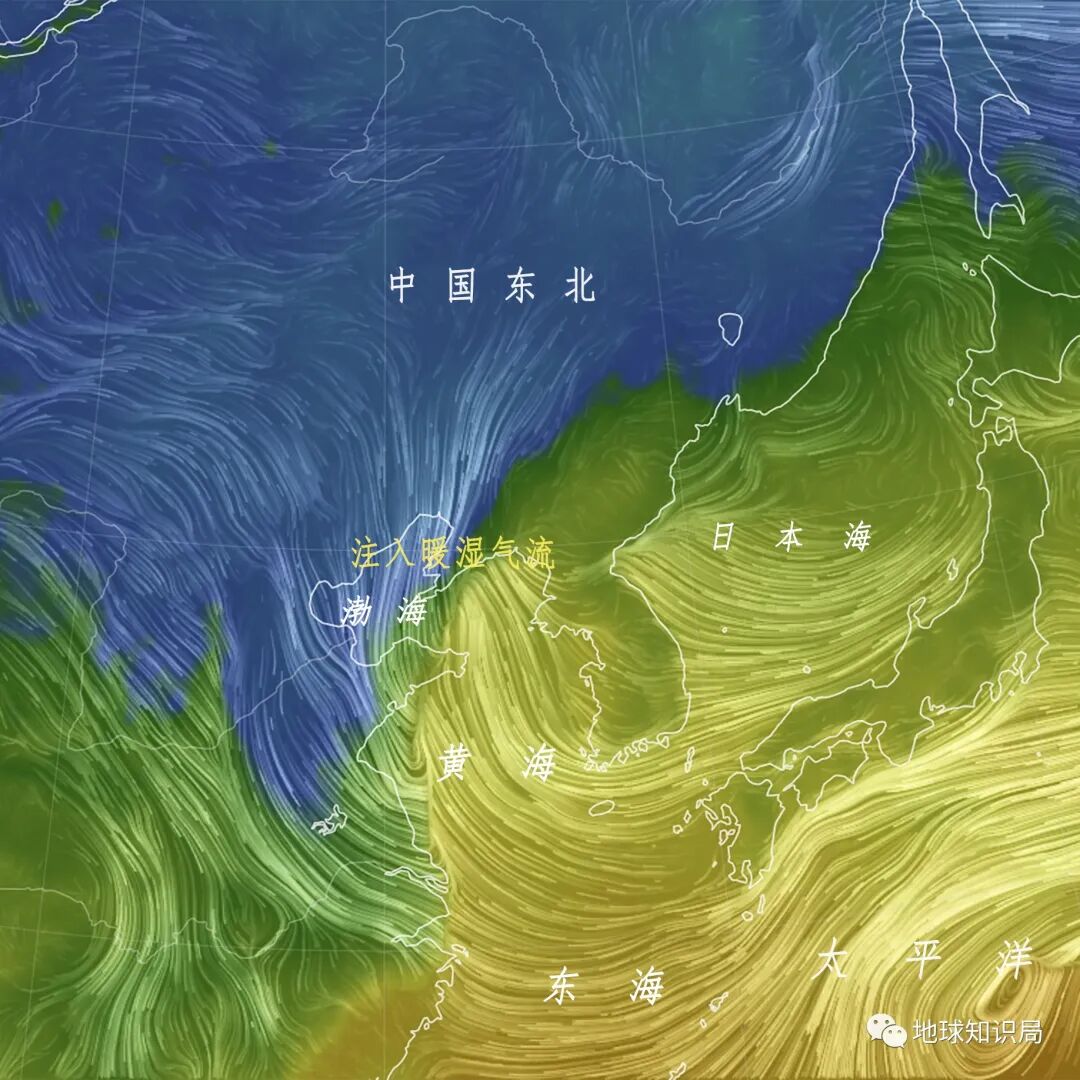 与此同时,黄海附近形成了一个气旋,吸收了海上的能量与水汽之后在辽宁登陆。气旋一路向西,不断为东北地区注入暖湿气流,带来强降雨。甚至被冷空气包抄,形成一个逆温层,导致持续性的降雪。