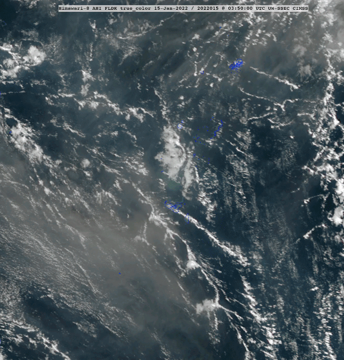 据汤加地质局的消息,位于汤加首都努库阿洛法以北约65公里处洪阿哈阿帕伊岛附近的海底火山(南纬20.550°,西经 175.385°),于1月14日,15日两日连续喷发,喷发形成火山灰与蒸汽在太平洋海面形成“蘑菇云”,首都努库阿洛法也出现2米高的海啸。