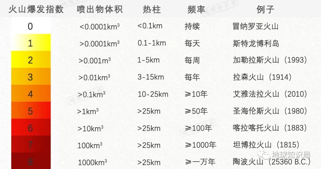 火山的内部不断积蓄能量,其喷发会释放出炙热的岩浆、大量含硫的挥发性成分以及火山灰等火山碎屑物质。对于火山爆发的强度,我们一般用火山爆发指数VEI(Volcanic Eruption Index)来进行描述,影响因子包括喷出物的体积、火山云状态以及一些定向和定量观测指标。