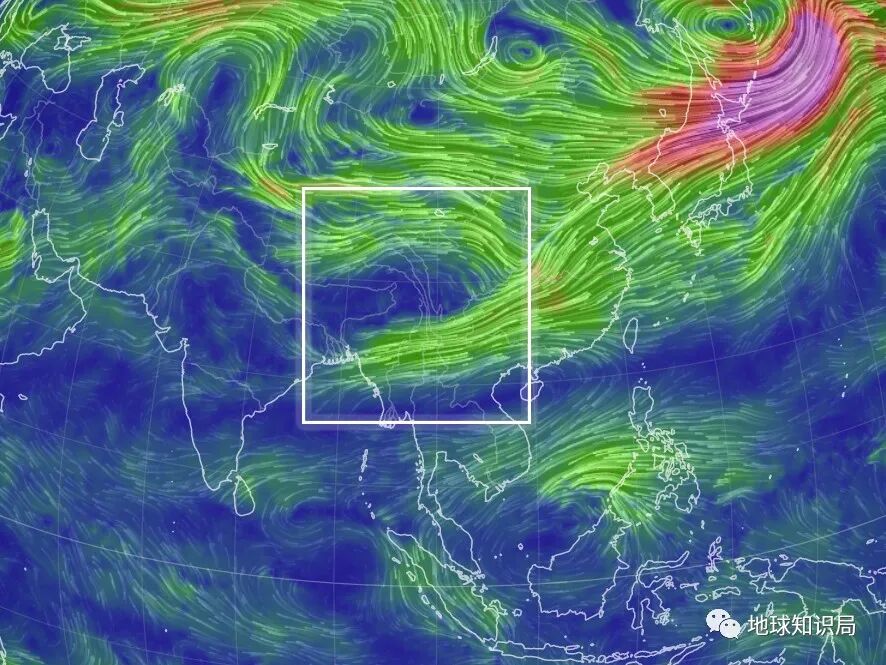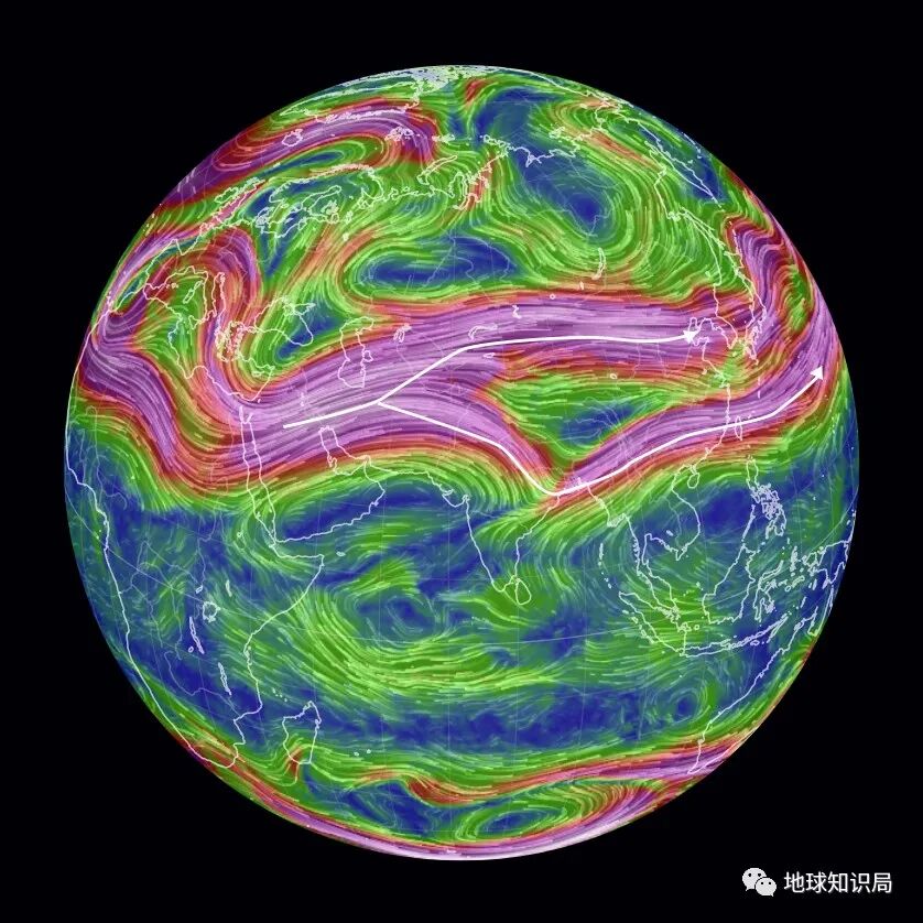 在此之上的250hPa高度场上,自西向东环绕全球、中心最大风速可达50-60m/s的副热带急流。这一急流在冬季也分为了南北两支。其中位于青藏高原南侧、对流层高层的南支副热带急流经过恒河平原,最后在中国南部到日本一带,与北支副热带急流汇合。