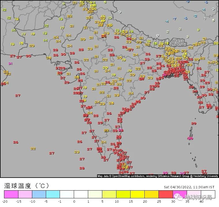 在此次热浪高峰期(4月29日至30日)一天中最热的时候,印度和巴基斯坦的许多地区的湿球温度都超过28 ℃,印度中部城市那格浦尔甚至记录了32.2 ℃的湿球温度。