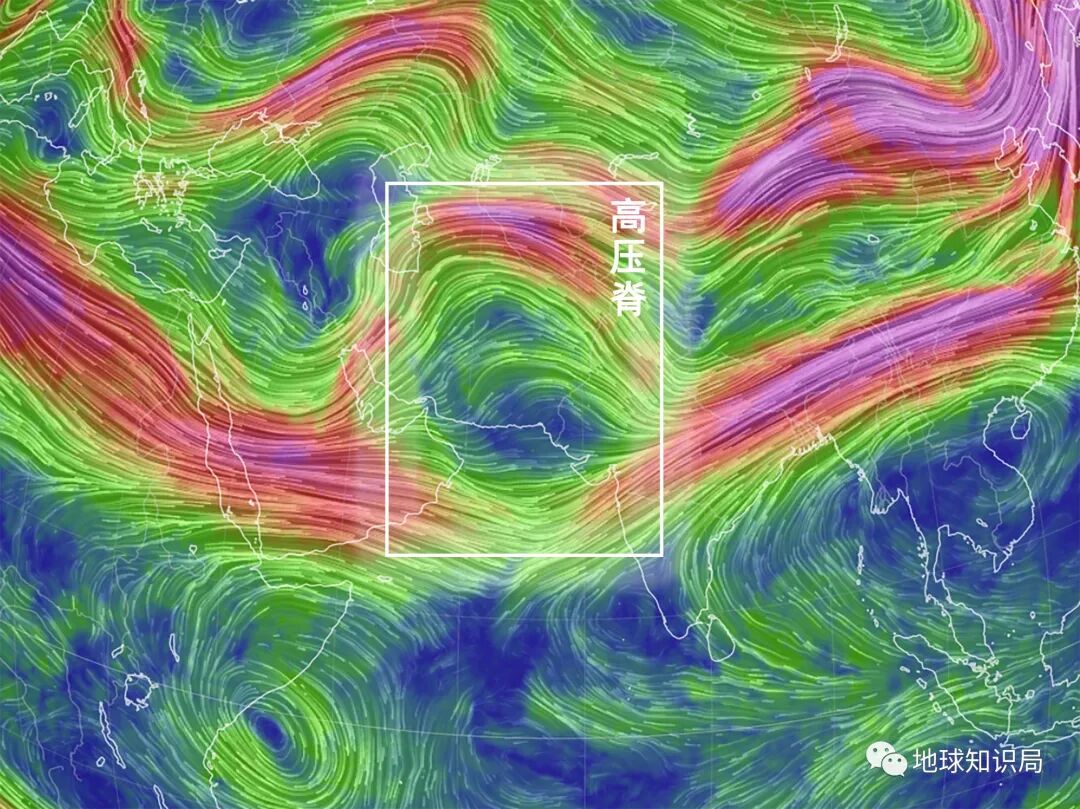 然而,这样的西部扰动系统并非固定不动。在南亚季风未开始前和季风结束后,副热带急流的纬度位置一般会有5-10度的波动。今年的副热带急流异常北伸,在印度次大陆上空形成了一个异常强烈的高压脊区,相对稳定的热穹顶使得炎热干燥的气团长期停滞在南亚大陆。