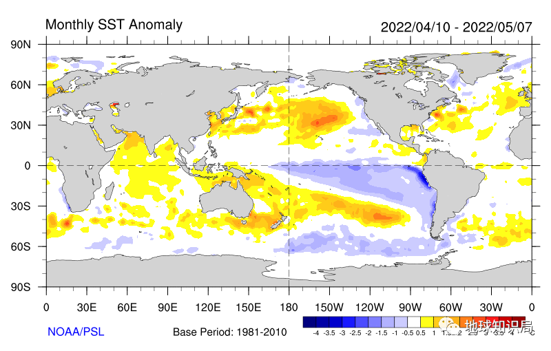 在急流与西部扰动异常的背后,还存在着更加遥远的幕后黑手。在相距数千公里之外的热带中东部太平洋,海水冷异常标志着拉尼娜事件的发生。在过去的半个世纪里,拉尼娜事件往往伴随着印度更加干燥和炎热的春季。东太平洋的拉尼娜现象加剧了此次3月和4月的高温,并显著削弱了印度的季风前降雨。